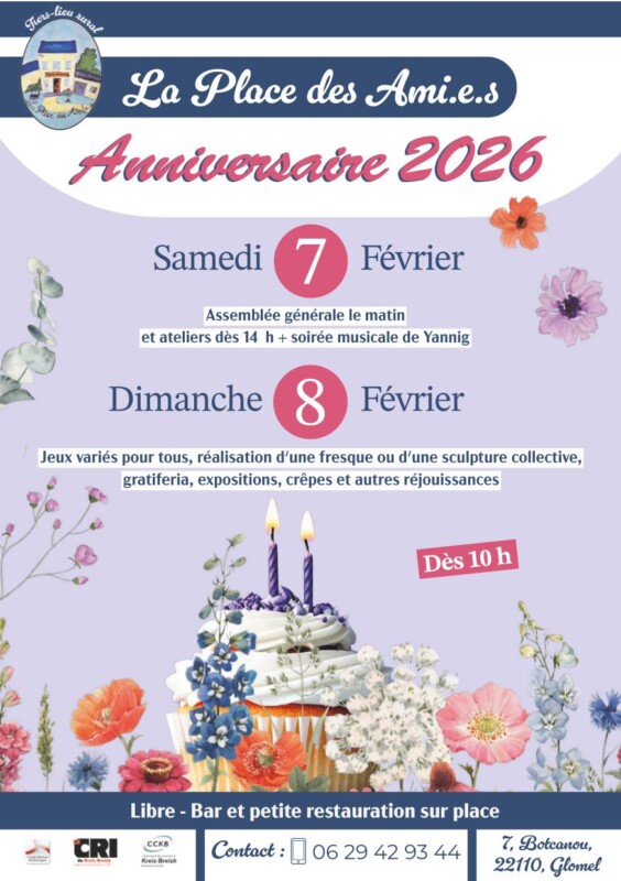 Samedi 7 février : 10h-12h Assemblée générale – verre de l’amitié et repas partagé (chaque participant.e apporte un plat à partager) – 14h début des animations – 15h séance de Yoga Nidra avec Christelle (art de la relaxation profonde) – 18h restauration – 18h30 Yannig Jaouen enchantera la soirée de ses créations musicales… et bien d’autres réjouissances favorisant bien-être individuel et coopération !