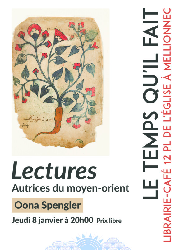 Oona nous propose une nouvelle soirée lecture, à la rencontre de voix d’autrices du Moyen-Orient. Apportez vos coussins, couvertures, vos oreilles grandes ouvertes, on fournit la tisane et c’est parti pour une heure d’écoute…