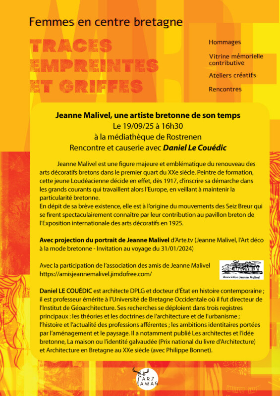 Jeanne Malivel est une figure majeure et emblématique du renouveau des arts décoratifs bretons dans le premier quart du XXe siècle. Peintre de formation, cette jeune Loudéacienne décide en effet, dès 1917, d’inscrire sa démarche dans les grands courants qui travaillent alors l’Europe, en veillant à maintenir la particularité bretonne. En dépit de sa brève existence, elle est à l’origine du mouvements des Seiz Breur qui se firent spectaculairement connaître par leur contribution au pavillon breton de l’Exposition internationale des arts décoratifs en 1925. Avec projection du portrait de Jeanne Malivel d’Arte.tv (Jeanne Malivel, l’Art déco à la mode bretonne - Invitation au voyage du 31/01/2024) Avec la participation de l’association des amis de Jeanne Malivel Daniel LE COUÉDIC est architecte DPLG et docteur d’État en histoire contemporaine ; il est professeur émérite à l’Université de Bretagne Occidentale où il fut directeur de l’Institut de Géoarchitecture. Ses recherches se déploient dans trois registres principaux : les théories et les doctrines de l’architecture et de l’urbanisme ; l’histoire et l’actualité des professions afférentes ; les ambitions identitaires portées par l’aménagement et le paysage. Il a notamment publié Les architectes et l’idée bretonne, La maison ou l’identité galvaudée (Prix national du livre d’Architecture) et Architecture en Bretagne au XXe siècle (avec Philippe Bonnet).