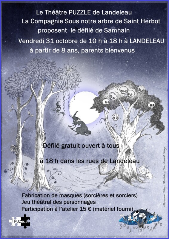 Pour cette journée de Samhain, nous proposons aux enfants, aux ados et aux adultes de se réunir dans la salle polyvalente de Landeleau pour préparer un défilé. Le matin fabrication des masques de sorciers et sorcières avec Céline Markulic de la Compagnie Sous notre arbre, l’après-midi préparation des personnages avec Omar Cherrouk du Théâtre PUZZLE.