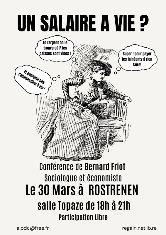 Pour faire simple, vous seriez payé toute votre vie d’adulte pour votre capacité à produire de la valeur pour la communauté, que vous occupiez un emploi ou non, et non pas en fonction du poste que vous occupez ou du travail que vous effectuez. Cela aurait pour conséquence mécanique l’abolition du chômage. Jeanne HILLION, une habitante de Rostrenen, vous invite à venir débattre de cette utopie.