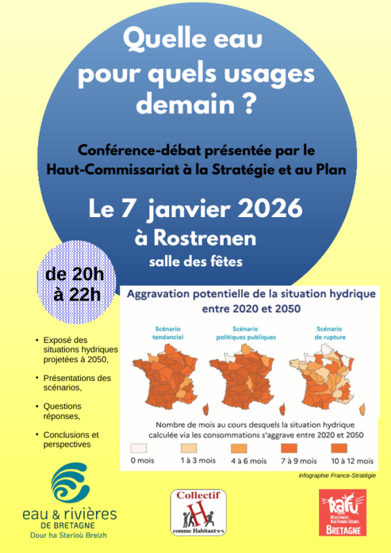 Le Haut-Commissariat à la Stratégie et au Plan et l’association Eau et Rivières de Bretagne ont le plaisir de vous inviter à participer à la conférence-débat qui aura lieu à la salle des fêtes Guillaume le Caroff à Rostrenen, le 7 janvier 2026 de 20h à 22h :