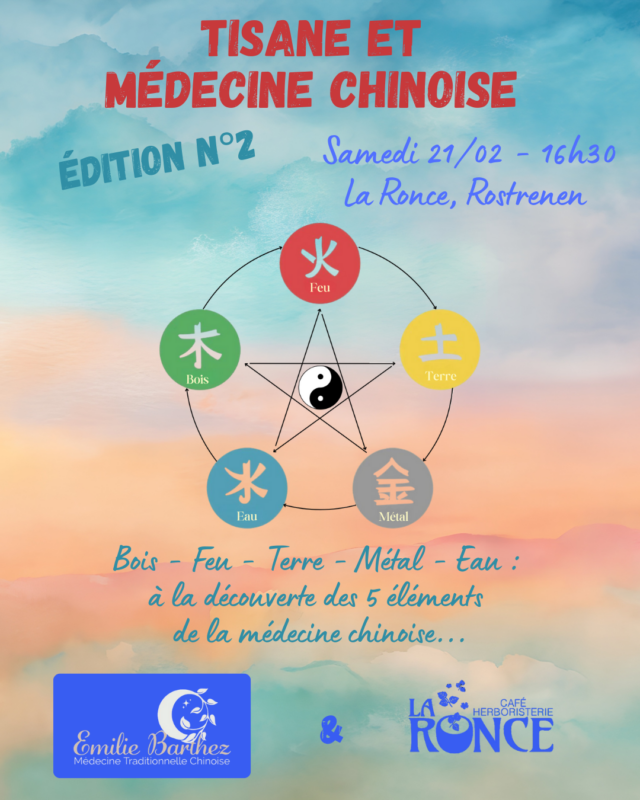 Samedi 21/02 à 16h30, rendez-vous au Café Herboristerie la Ronce à Rostrenen pour explorer les 5 éléments utilisés dans la pratique de la médecine traditionnelle chinoise.
