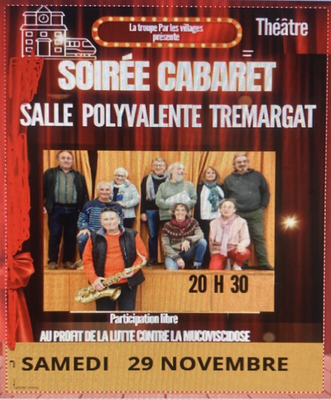 Samedi 29 Novembre 2025, la troupe de théâtre, “Par les Villages”, composée de comédien-nes amateurs du pays, donne une représentation de son spectacle. Le RDV est à 20 h 30 à la Salle polyvalente de Trémargat. La participation est libre.