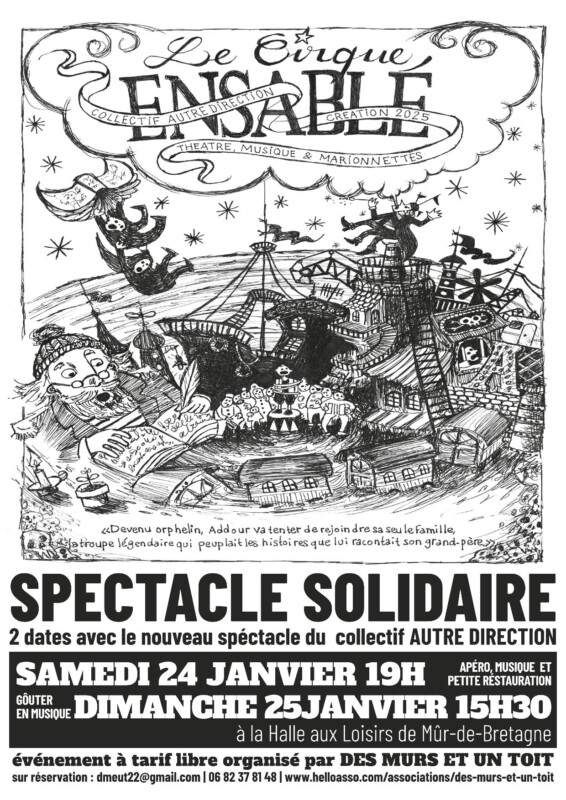 Événement culturel unique et exceptionnel à Mûr de Bretagne les samedi 24 janvier à 20h30 et dimanche 25 janvier à 16h30 à la Halle aux Loisirs : l’association Des Murs et un Toit y accueillera la Compagnie de Théâtre et Marionnettes Autre Direction pour la représentation du tout nouveau spectacle ” Le Cirque Ensablé”, mêlant univers onirique, marionnettes, poésies et aventures !