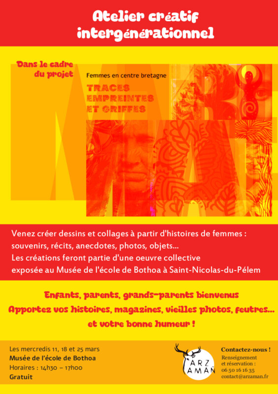 Projet “Femmes en Centre-Bretagne : Traces, empreintes et griffes” de l’association « Arz amañ », Rostrenen Un moment créatif et convivial pour tisser ensemble les histoires de femmes de notre territoire lié l’exposition “Filles garçons, mêmes chances, mêmes avenir” organisé par le Musée de l’école de Bothoa (avril 2026/octobre 2027) Dans le cadre de ce projet, vos créations seront exposées à l’école de Bothoa à Saint-Nicolas-du-Pélem.